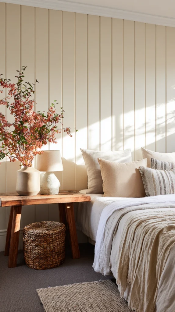 Simple vertical batten paneling on a feature wall, painted in the same color as the wall surface so that the shadow lines between the battens create the effect rather than color contrast, costs a morning of installation time and a modest material budget, and creates a room with the specific quality of architectural consideration that the plain-walled room entirely lacks.