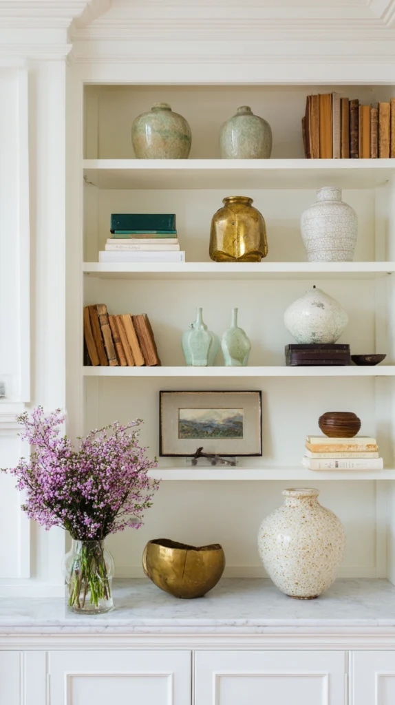 Arrange books on open shelves with a combination of vertical shelving and horizontal stacking, mixing books with small objects and plants, and do not color-organize unless the resulting palette genuinely suits the room — the artificial rainbow of color-organized books is more Instagram-ready than genuinely beautiful in a room that is actually lived in.