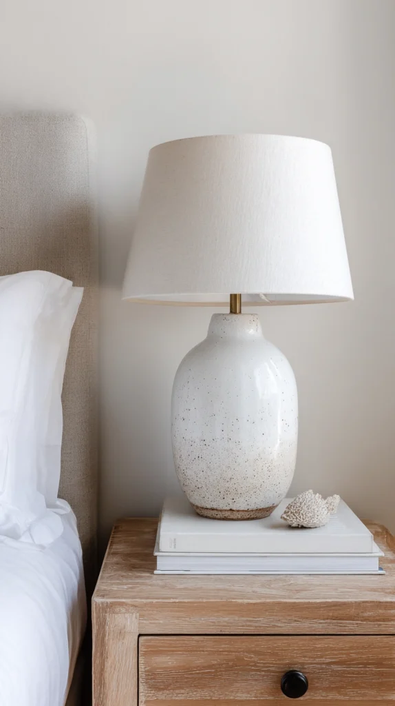 A ceramic table lamp in white or pale blue costs $30–$80. A hand-thrown stoneware mug as a water vessel costs $8–$20. A small ceramic bud vase costs $5–$15. The books should be ones that are actually being read rather than chosen for their spines — authenticity in the bedside arrangement is immediately felt by anyone who sits on the bed and looks at it closely, which is the position from which it matters most.