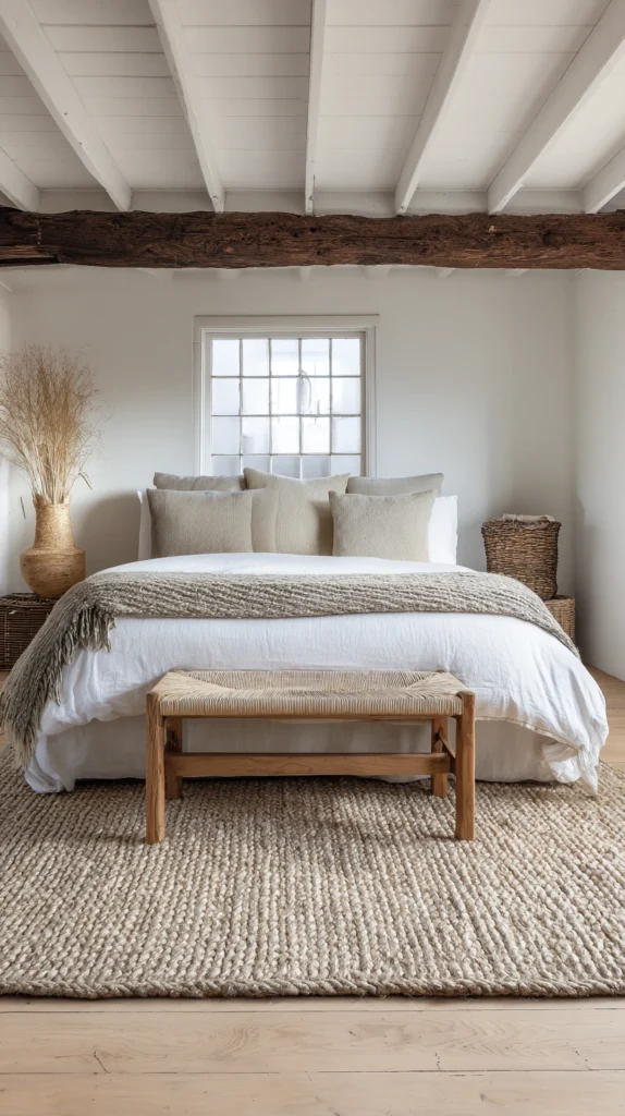 A seagrass rug in 160×230 cm costs $60–$150. Jute in the same size runs $50–$120. Position centrally beneath the bed with equal overhang on both sides and at the foot — the rug should be large enough for both feet to land on it when getting out of bed on either side, which is the proportion that makes a bedroom rug feel generous rather than undersized.
