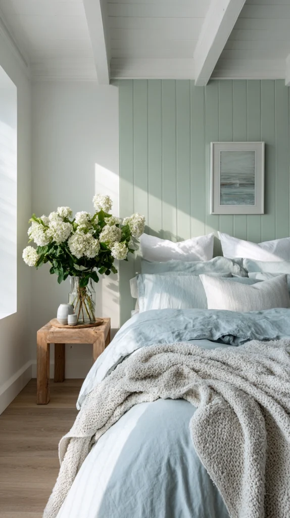 Start with the bedding and the wall colour — those two elements establish the palette from which every other decision follows naturally. Once the ice blue linen and the pale sage wall are in place, every subsequent choice becomes easier because the room already has a clear character that new elements either suit or do not, and the distinction is always immediately obvious.