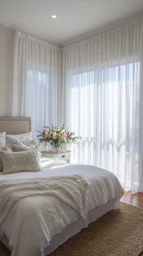 Sheer curtains in white or very pale cool grey hung at ceiling height filter natural light into the bedroom as a soft, diffuse, slightly blue-tinted quality — the kind of light that makes a pale room feel genuinely cool and airy rather than simply bright. They move in any air movement through an open window, which adds life and atmosphere to the bedroom without introducing warmth.