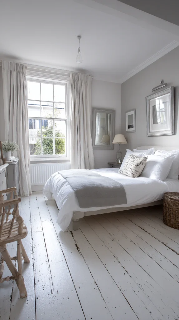 Style tip: Add a simple woven wool rug in a cool grey or pale natural tone beside the bed rather than covering the painted boards entirely. A rug that reveals painted floor on both sides creates a layered floor arrangement — the warmth and softness of the rug in the sleeping zone, the cool painted surface in the wider room — that suits the modern cottage bedroom considerably better than wall-to-wall carpet or a rug that covers the entire floor.