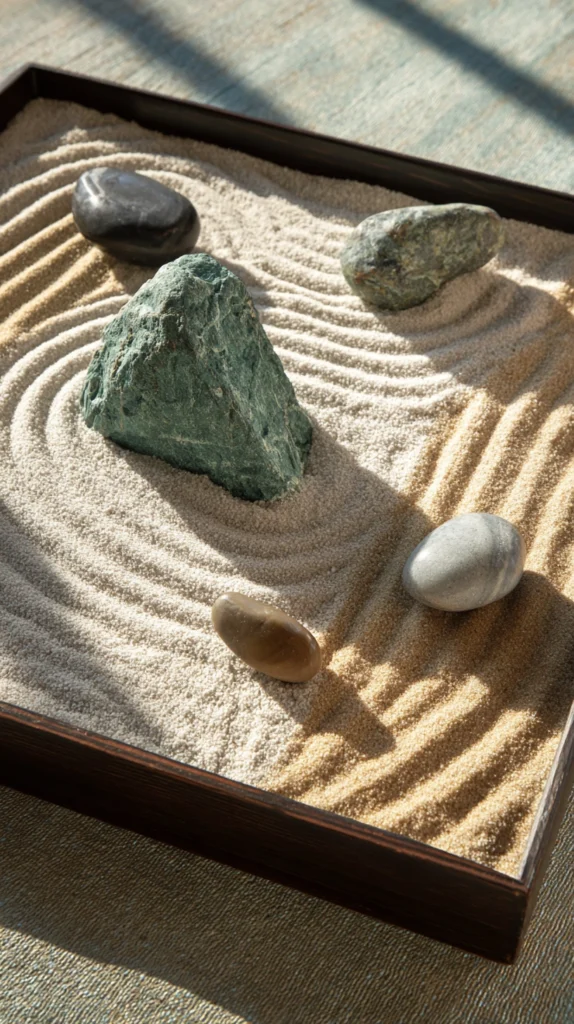 Add single larger stones, small Buddha statues, or miniature plants like air plants or succulents creating focal points within raked patterns. The desktop scale makes these gardens accessible and practical while the raking activity provides mindful breaks during work days. Position where they’re easily accessible encouraging regular interaction and pattern refreshing.