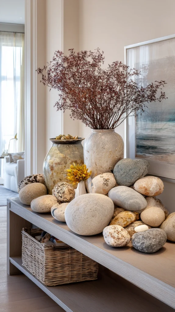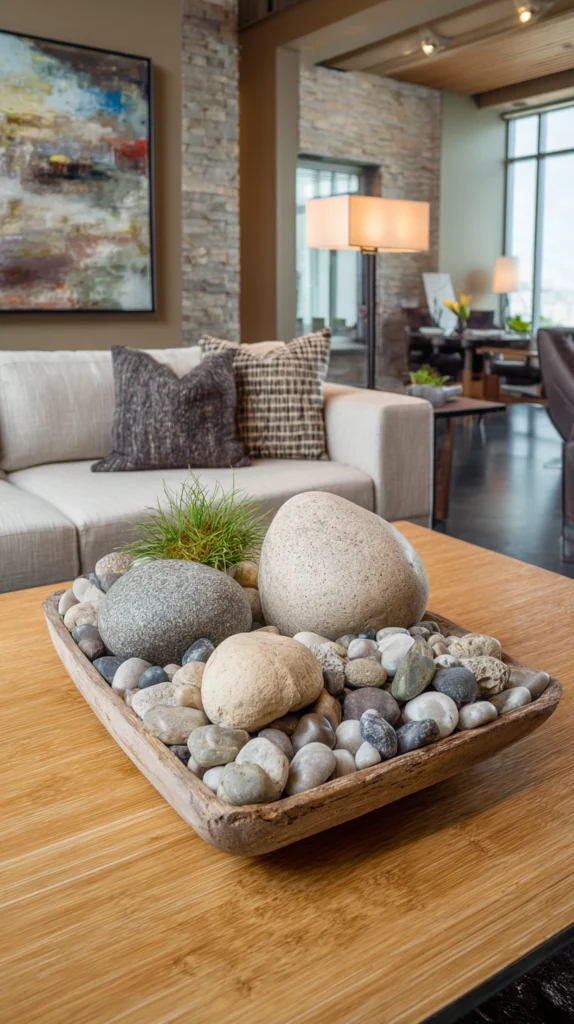 Arrange larger smooth river rocks in shallow decorative bowls or trays creating organic stone compositions suggesting natural riverbeds or mountain landscapes in miniature form. Choose rocks in similar color families creating cohesive presentations or embrace varied tones for naturalistic diversity, position larger specimens as focal points with smaller stones surrounding, and perhaps add tiny figurines, bridges, or miniature structures creating narrative elements.