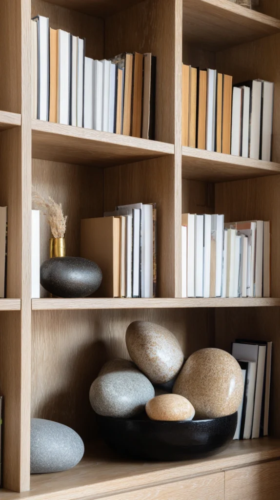 Incorporate small pebble-filled vessels on bookshelves adding textural variety and natural elements among books and decorative objects creating more dynamic visually interesting shelf styling. Use small bowls, decorative boxes, or simple glass containers filled with attractive stones positioned throughout shelving breaking up linear book spines and providing organic textural contrast.