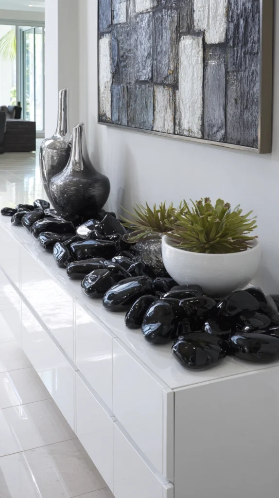 Create bold sophisticated displays using exclusively black polished stones providing dramatic contrast in light-colored modern interiors and establishing strong graphic impact. Fill white or light-colored containers with glossy black river rocks creating stark high-contrast presentations, use matte black lava rock for more organic natural aesthetics, or combine varied black stone finishes creating subtle textural variation within the monochromatic palette.