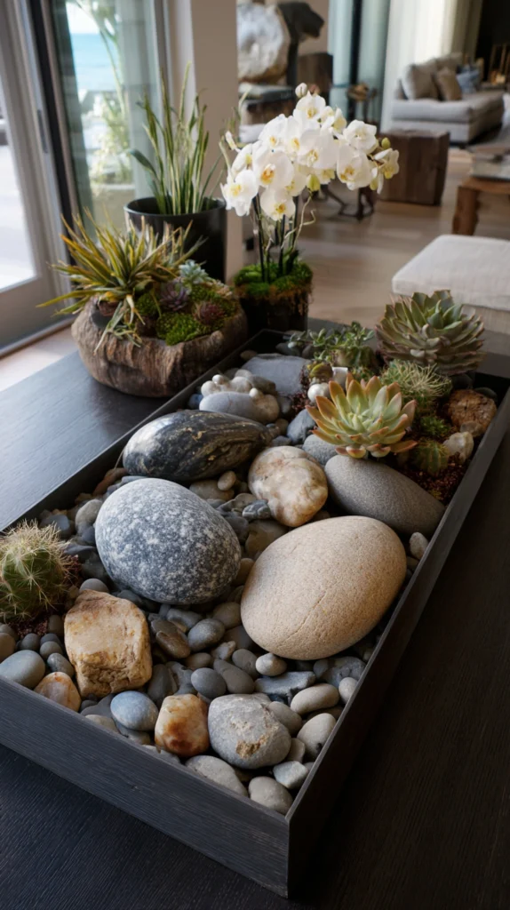 The appeal lies in pebble gardens’ flexibility working within any decorating style from zen minimalism to contemporary sophistication, occupying spaces ranging from small tabletop dishes to substantial floor installations.