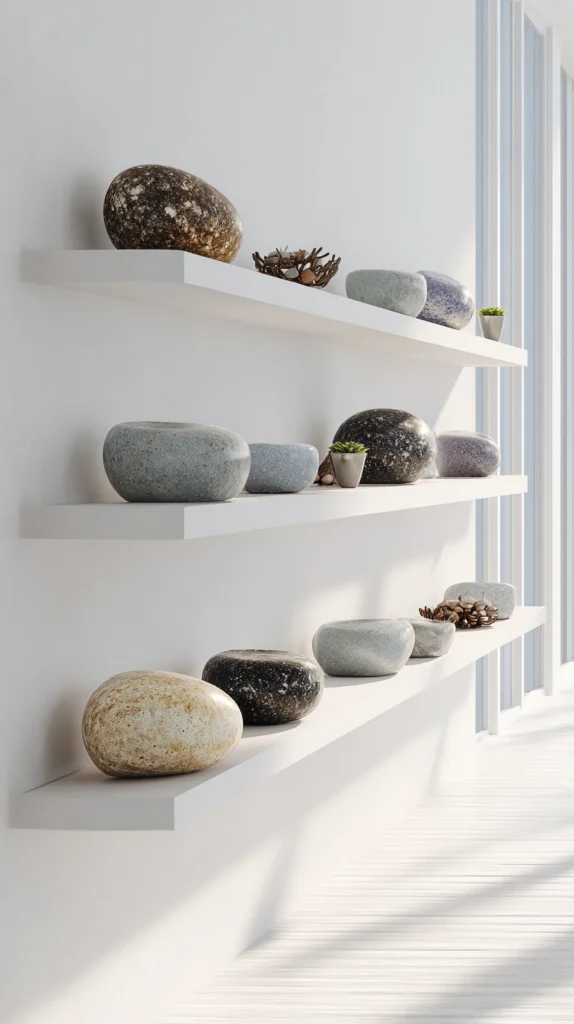 Design dedicated floating shelves specifically for pebble garden displays creating gallery-like presentations elevating decorative stones to featured design elements worthy of prominent exhibition. Install simple floating shelves in materials coordinating with room décor, arrange multiple pebble-filled containers in varied sizes creating curated collections, and perhaps include small candles, simple sculptures, or minimal greenery complementing stone displays.