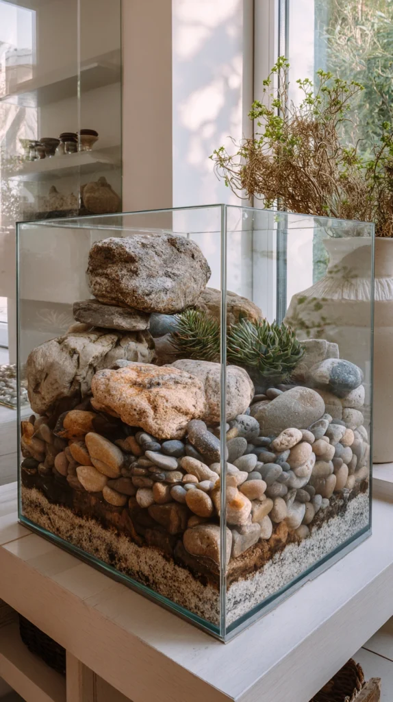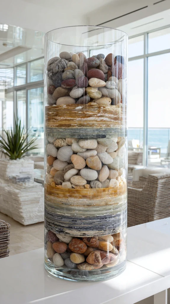Design transparent containers showcasing decorative layers using varied pebble colors, sizes, and textures creating dimensional displays where the layering itself becomes the primary visual interest. Choose clear glass cylinders, bowls, or geometric terrariums allowing full layer visibility, create stripes using different colored stones, design ombre effects transitioning from dark to light, or alternate pebble sizes creating textural variation. Include single sculptural branches, air plants, or small succulents emerging from stone surfaces adding living elements.