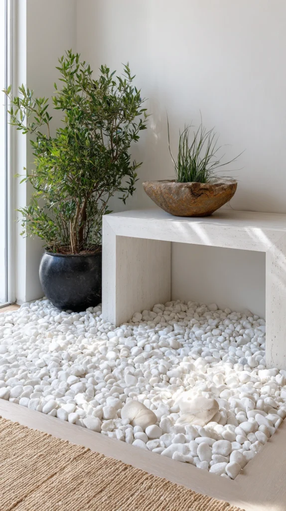Indoor pebble gardens bring natural texture and organic elements into interiors through decorative stone applications that require zero watering, never need repotting, and maintain their appearance indefinitely unlike living plants demanding ongoing care.