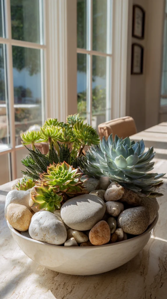 Combine living succulents with decorative pebble ground covers creating low-maintenance indoor gardens where stone mulch prevents soil exposure while providing attractive textural contrast against plant forms. Choose shallow wide containers providing adequate drainage, plant drought-tolerant succulents in well-draining soil, and top dress with small decorative pebbles creating finished professional appearances. Select stone colors complementing succulent tones whether that’s dark stones contrasting with pale plants or coordinating earth tones creating harmonious natural palettes. The stone mulch reduces watering frequency by minimizing evaporation while its decorative quality elevates simple succulent plantings into designed compositions.