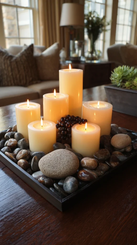 Design elegant table centerpieces combining pillar candles with surrounding pebble arrangements creating sophisticated displays for dining tables or coffee tables suitable for everyday or special occasions. Arrange pillar candles in varied heights on decorative trays or shallow bowls, surround with small smooth pebbles creating the impression of candles emerging from stone landscapes, and perhaps add small mirror tiles beneath reflecting candlelight.