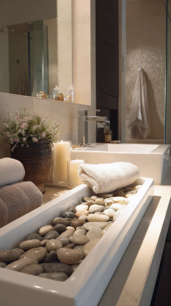 Create resort-inspired bathroom environments using pebble accents in soap dishes, vanity trays, or decorative bowls establishing calming spa atmospheres through natural stone elements. Fill shallow trays with smooth river rocks positioning bar soaps atop the stones allowing proper drainage and airflow, create pebble-filled vanity organizers holding toiletries attractively, or position decorative bowls filled with beautiful stones adding organic texture.