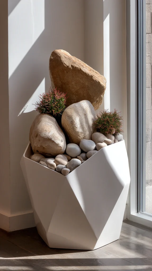 Use contemporary geometric planters including hexagonal, triangular, or faceted designs filled with contrasting smooth organic pebbles creating interesting tension between angular containers and natural rounded stones. Choose containers in materials like concrete, metal, or ceramic in minimalist forms without excessive decoration, fill with pebbles in colors providing either subtle coordination or deliberate contrast, and position where the geometric forms receive proper appreciation.