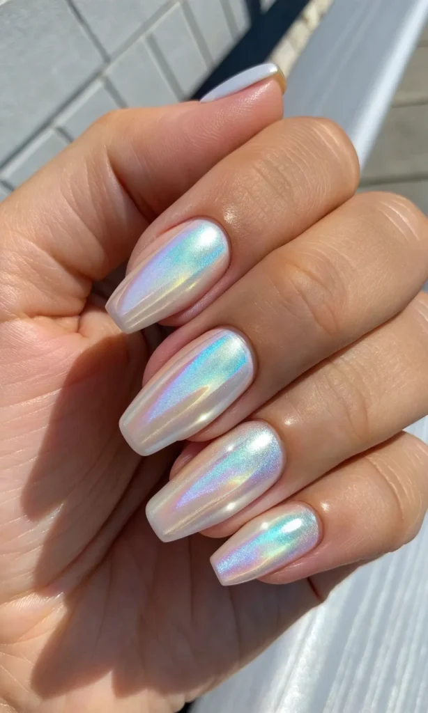 This timeless look mimics the soft glow of pearls. With a pale pink or white base and a pearly topcoat, your nails will reflect a subtle rainbow sheen that looks elegant and natural. It’s ideal for brides, formal events, or anyone who wants a clean and luxurious manicure.