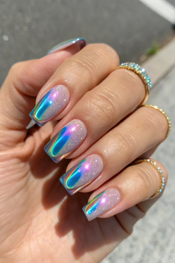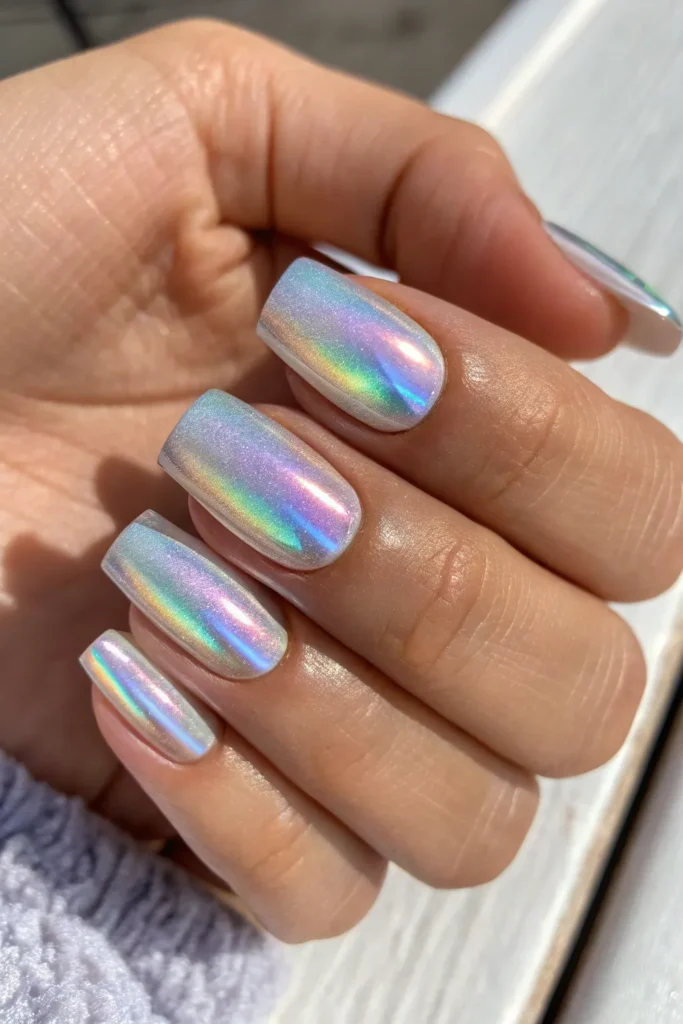 For a futuristic yet feminine look, try holographic chrome nails. The metallic finish shines in every color of the rainbow, creating a stunning reflective effect that feels high-fashion.