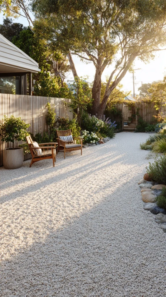 A raked gravel or sand sea — a generous expanse of fine white or pale grey gravel raked into precise parallel lines or concentric circular patterns around carefully positioned stones — is the defining and most specifically Zen garden element available. The raked gravel sea represents water — the lines of the rake suggesting the movement of ocean waves, river currents, or the surface ripples of a still pool — creating a meditative visual landscape of extraordinary calm and genuine symbolic depth within the physical boundary of the backyard.