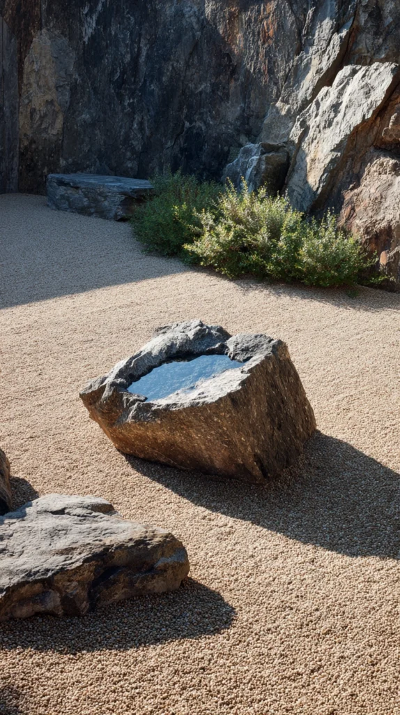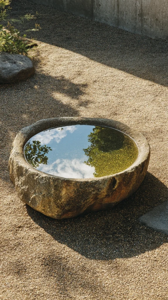 A stone water basin — a simple, slightly irregular natural stone carved or found with a natural hollow, filled with clean water — creates a Zen garden element of extraordinary material simplicity and genuine wabi-sabi beauty. The stone basin, or tsukubai, is a traditional Japanese garden element associated with the tea ceremony — the act of washing hands before entering the tea house translated into a garden feature of genuine ritual meaning and beautiful, simple material presence. A natural stone basin filled with still water reflects the sky, the surrounding garden, and the changing light of every passing hour.