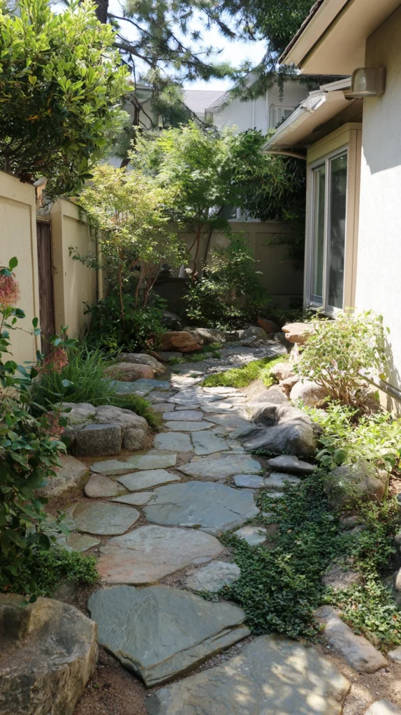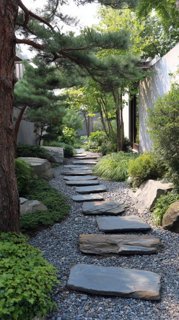 A stepping stone path — large, flat natural stones set at a comfortable walking stride distance through the moss, the gravel, or the garden planting — creates the primary circulation element of the Zen garden and the most important single design decision for the garden’s spatial experience.