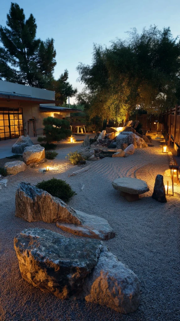 Warm, low-level garden lighting — simple stone lanterns with real candles or LED candle inserts, low-voltage path lights beside the stepping stones, and uplighters positioned at the base of the specimen tree — creates a Zen garden of extraordinary evening beauty and genuine nocturnal meditative atmosphere.
