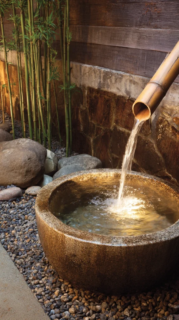 A bamboo shishi-odoshi water feature — the traditional Japanese deer scarer, a bamboo pipe that fills with water, tips to release it into a stone basin below, and returns to its upright position with a gentle knock against a stone — creates a Zen garden sound element of extraordinary meditative quality and complete cultural authenticity.