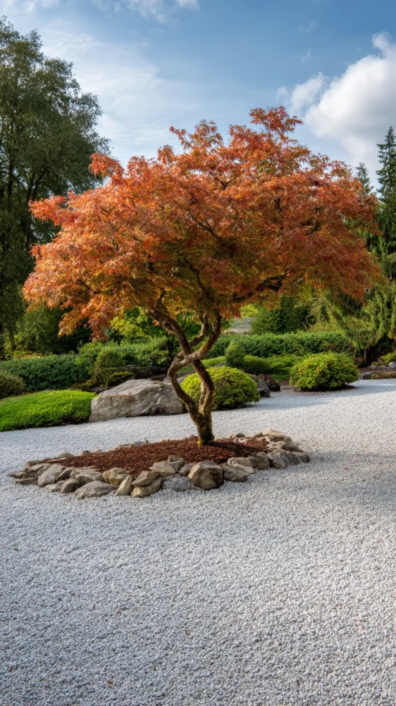 A Japanese maple — Acer palmatum — positioned as the single focal point tree of the Zen garden creates a plant of extraordinary seasonal beauty and genuine Zen aesthetic appropriateness. The Japanese maple provides seasonal interest in every month of the year — the delicate emerging foliage of spring, the full canopy of summer, the extraordinary red and orange autumn color, and the elegant bare branch structure of winter — making it the most seasonally complete and most genuinely beautiful single tree available for the Zen garden focal position.