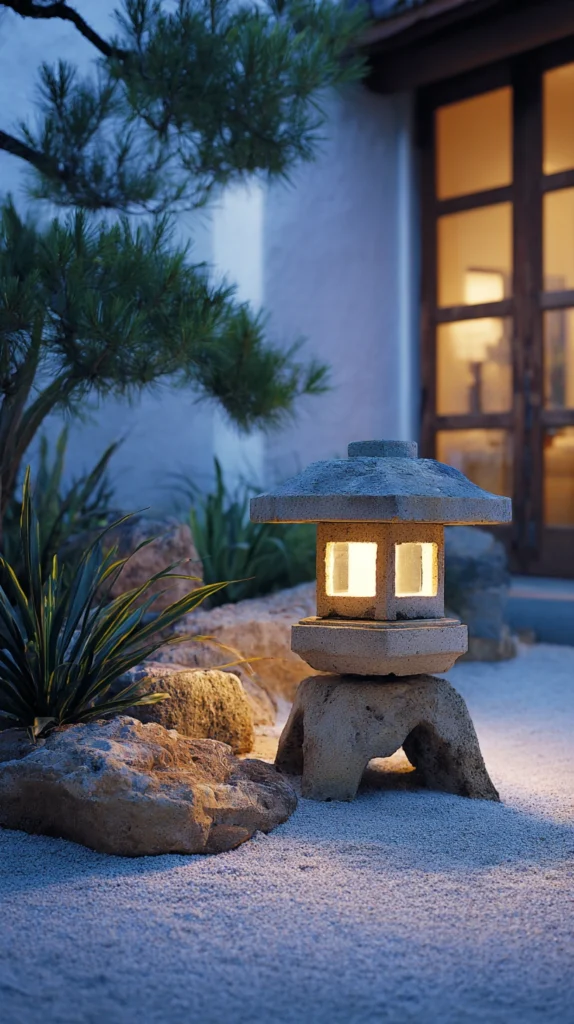 A traditional Japanese stone lantern — a carved granite or natural stone lantern of simple, authentic form positioned at the garden edge, beside the water feature, or as a path marker — creates a Zen garden feature of genuine historical authenticity and considerable material beauty. The stone lantern is one of the oldest and most specifically Japanese garden elements — its presence in the Zen garden creating an immediate and complete connection to the centuries-old tradition of Japanese garden design and Japanese garden philosophy.