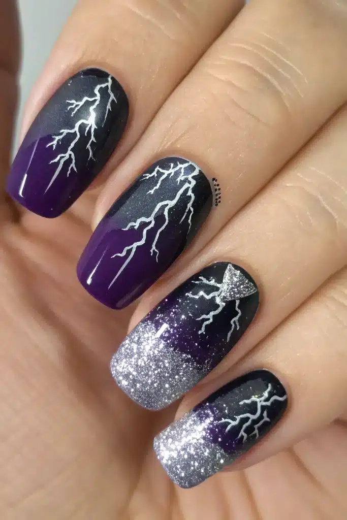 You can never go wrong with black and purple together—it’s dark, moody, and super stylish. Picture a deep purple base with jagged black streaks running across, almost like lightning bolts. If you want to kick it up a notch, add silver glitter in random spots. This design screams power and mystery.