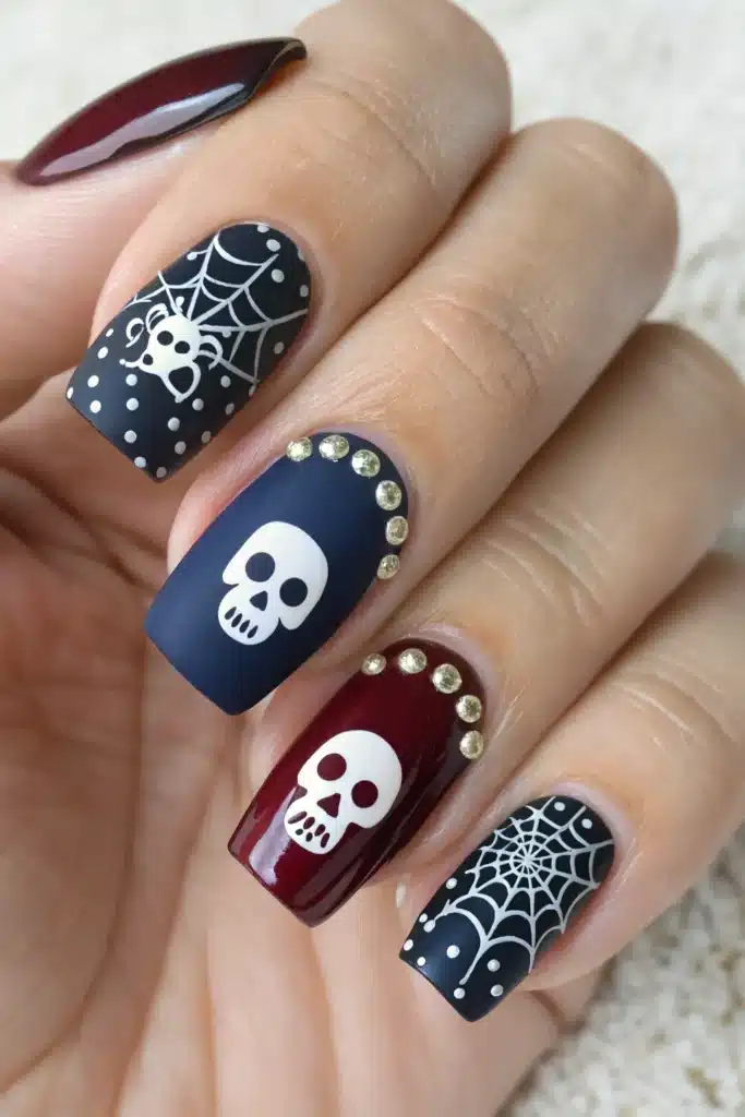 Tiny skull decals or hand-painted skulls add instant attitude to your nails. Pair them with dark shades like black, navy, or burgundy. You can even throw in metallic studs or spiderweb designs for extra edge.