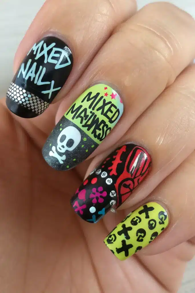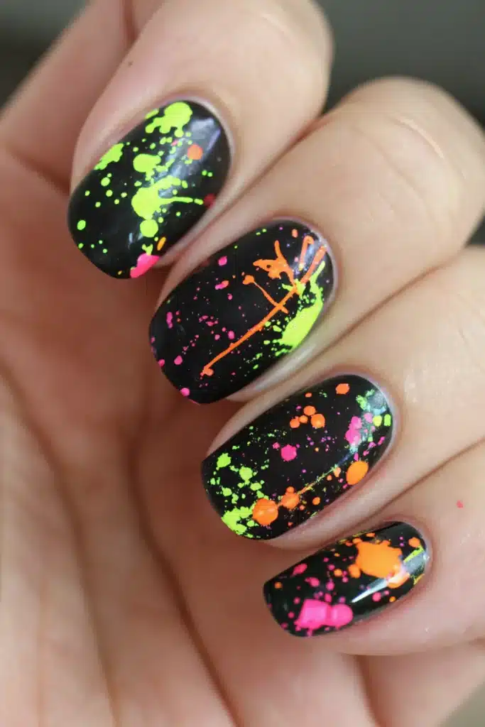 This one is pure chaos—in the best way. Start with a black base and flick neon polish across your nails for a messy, splattered effect. It looks like a paint fight on your fingertips, and it’s guaranteed to get attention.