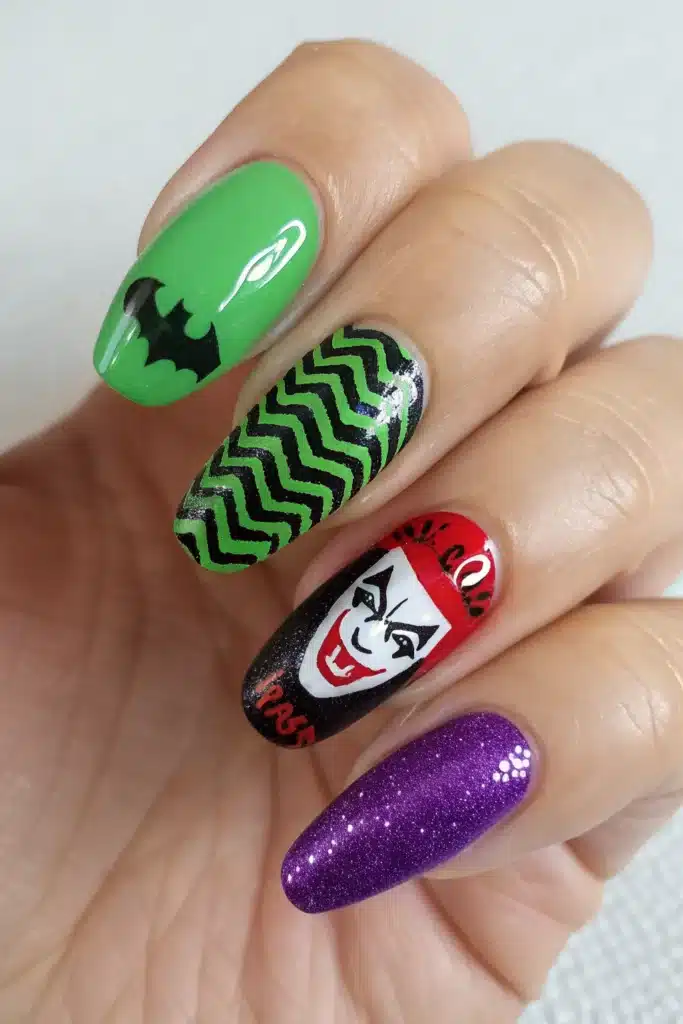 Channel a little chaotic villain energy with green, purple, and red. These colors, mixed with sharp designs like zigzags or stripes, give your nails a playful but edgy twist. It’s not too serious—it’s just bold enough to make a statement.