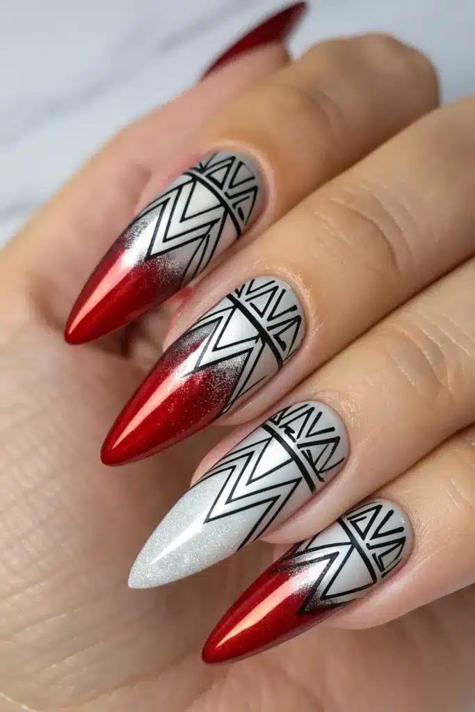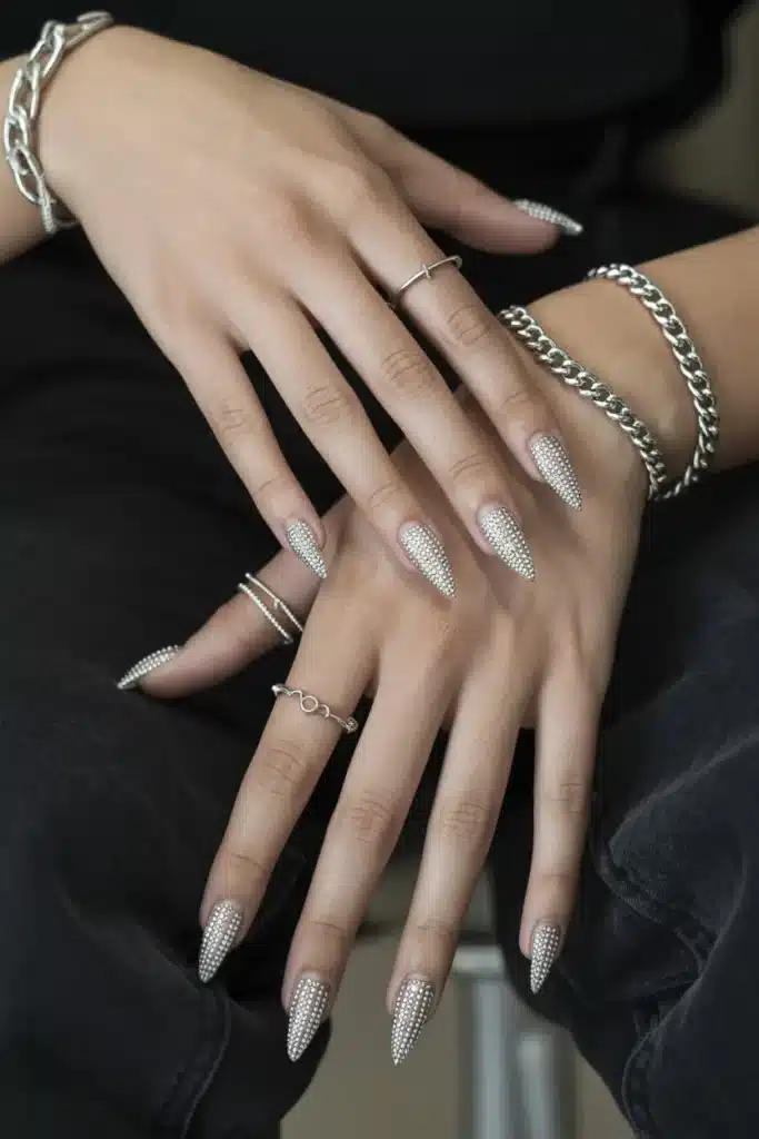 Shape matters, and nothing screams “edgy” like stiletto nails. Long, sharp, and daring, these nails are a statement even before you add color. Go for metallic silver with black geometric lines, or try a fiery red ombré.