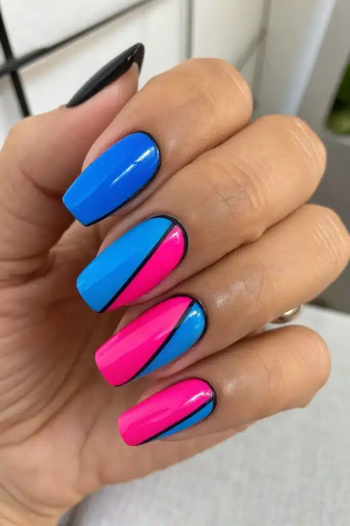 Ever seen nails that look like they belong in a comic book? That’s what bold black outlines can do. Take bright colors like pink, blue, or yellow and outline them with solid black lines. It creates a cartoon effect that’s playful yet edgy.