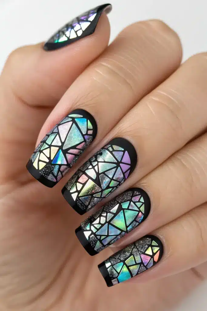Want nails that catch the light and keep people staring? Try a shattered-glass design. Using holographic foil pieces over a black or navy base gives your nails a broken-mirror vibe—chaotic yet beautiful. It’s edgy without needing extra details.