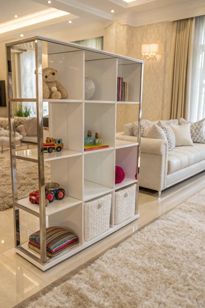 Install a modern console or cabinet that blends with your living room furniture. Store toys in labeled bins inside to keep the play area clean.
