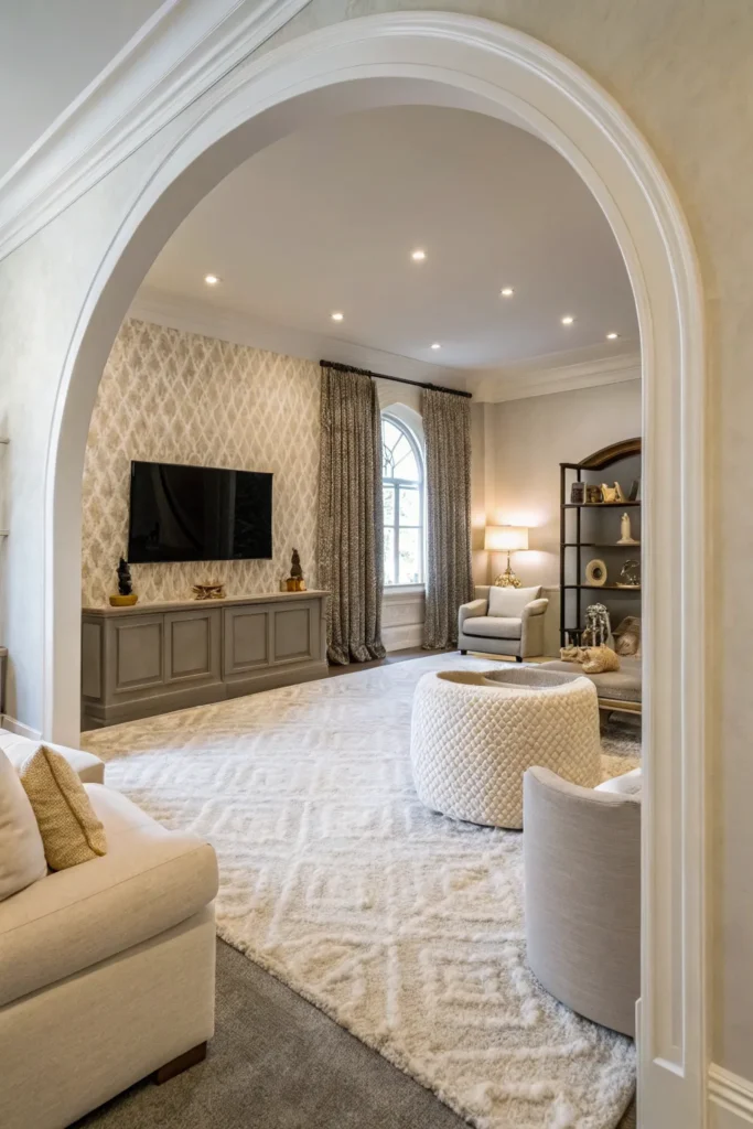 Paint or wallpaper a subtle arch shape behind the play corner to define the area without overwhelming it. Soft blush, warm taupe, or sage works beautifully.