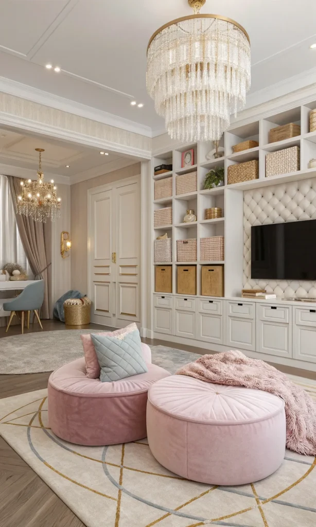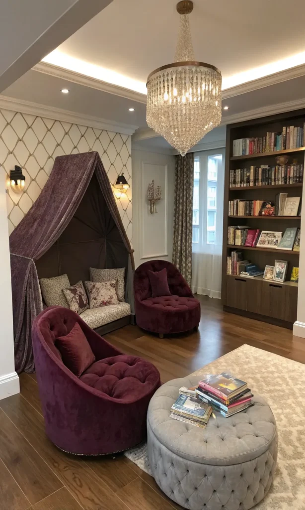 For a glamorous touch, include velvet ottomans or mini chairs in jewel tones like emerald or dusty rose. Pair this with gold-accented book ledges and a chic reading lamp.