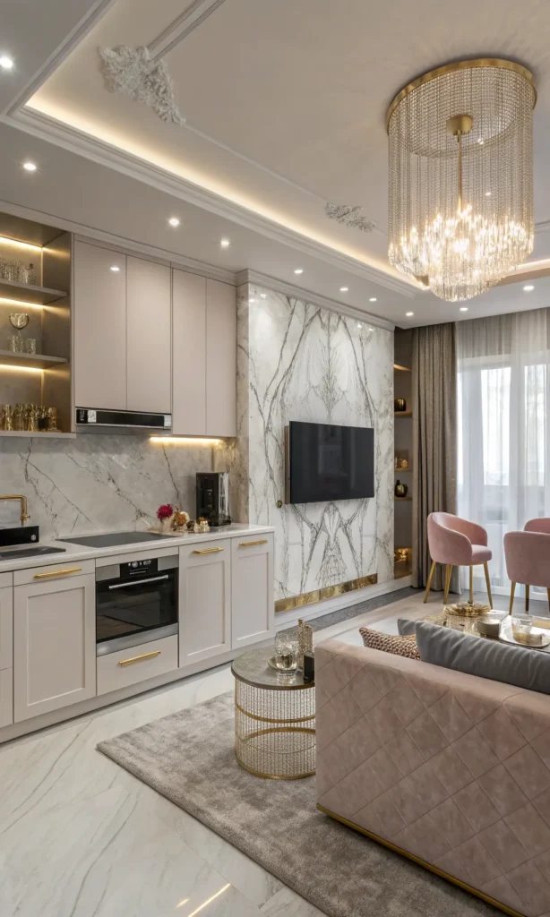 Top with plush cushions and minimal wall art like framed shapes or simple line-drawing prints to maintain a stylish tone.
