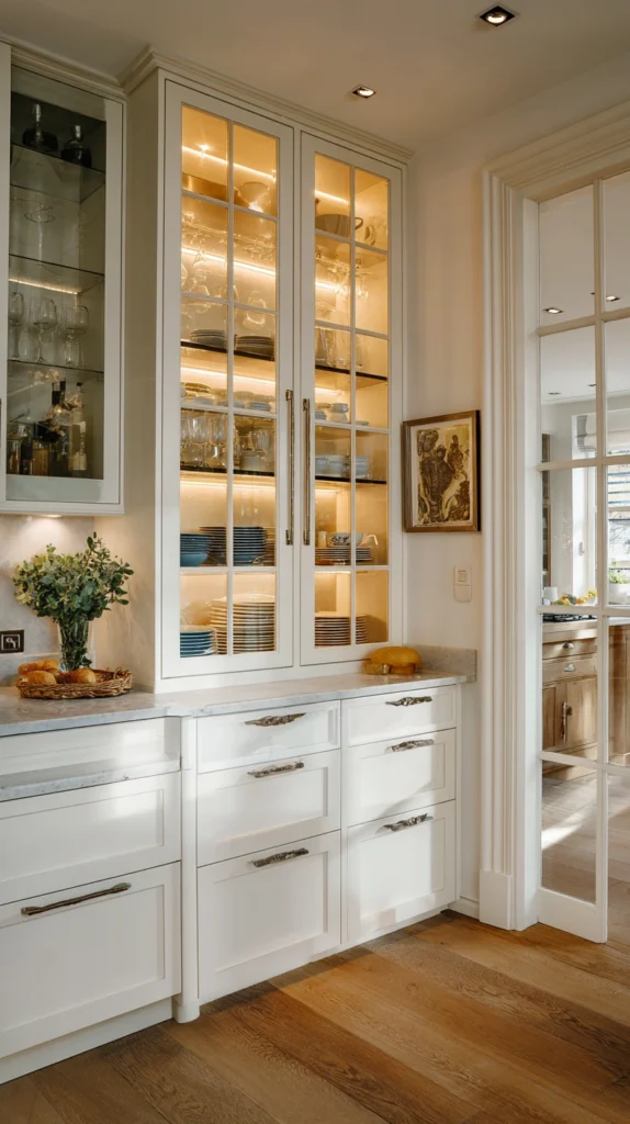 Install small LED puck lights or strip lights inside glass-front cabinets to illuminate displayed dishes, glassware, or collections, transforming cabinets into illuminated display cases. This accent lighting adds visual interest and depth while making it easy to find items inside cabinets even when ambient lighting is dimmed.