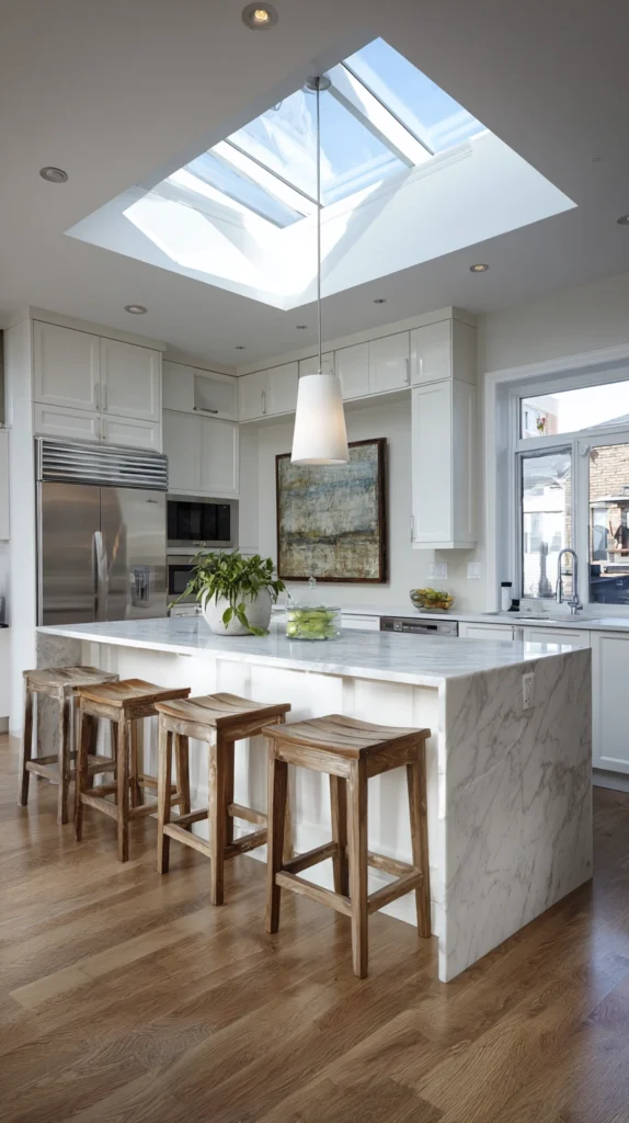 In kitchens with skylights or large windows, designers position pendant lights to complement natural light rather than compete with it. Hang pendants where natural light doesn’t reach—perhaps over an island away from windows—and choose fixtures that look beautiful whether illuminated or not since daytime may not require them.