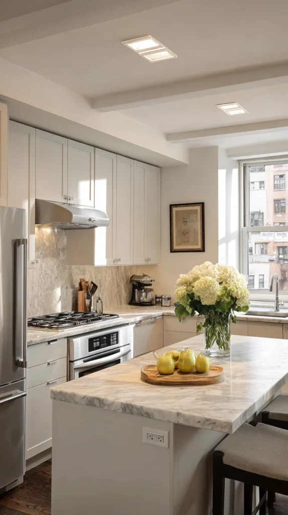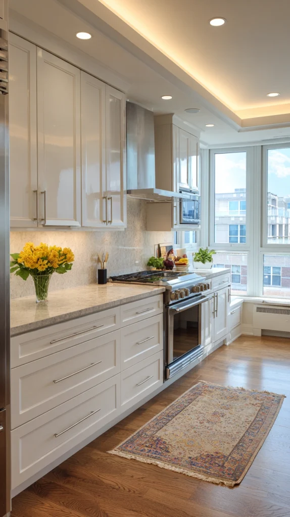 Designers layer this ambient lighting with under-cabinet task lights and perhaps small pendants over a breakfast nook where ceiling height isn’t constrained, creating adequate lighting diversity despite the low-ceiling challenge that rules out dramatic hanging fixtures.