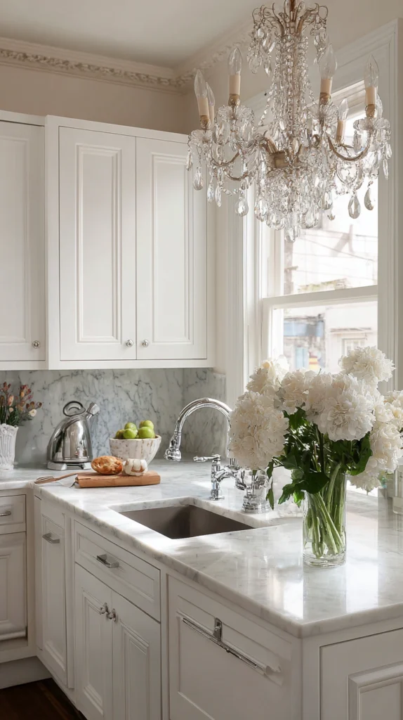 Position an unexpected chandelier or decorative pendant centered over the kitchen sink, elevating this utilitarian zone into a design moment. This placement provides excellent task lighting for washing dishes and food prep while adding personality and visual interest to an area typically lit only by overhead ambient sources.