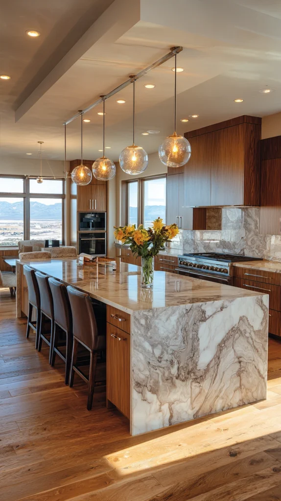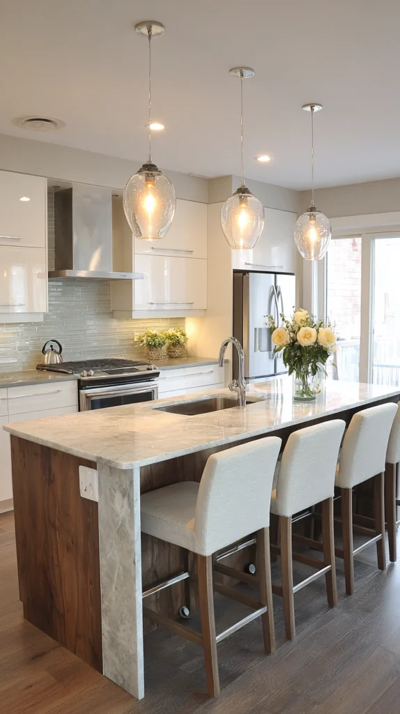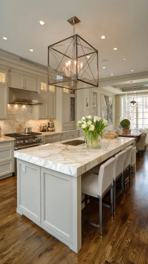 Designers swear by this trio arrangement because odd numbers feel more balanced than pairs, the spacing prevents dark zones between lights, and the elevated position creates intimate lighting for both food preparation and casual dining while adding sculptural beauty to the kitchen’s visual center.