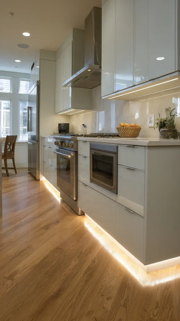 Install LED strips in the recessed toe-kick area under base cabinets, creating a floating effect where cabinets appear to hover above the floor.