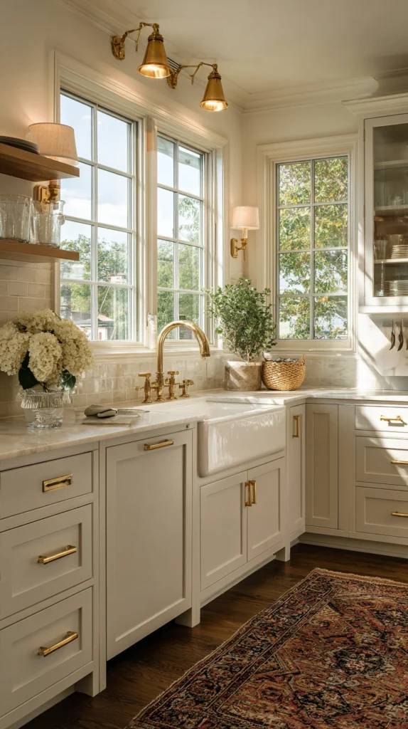 Designers strategically place sconces to balance the room’s lighting vertically, create rhythm through repetition, and introduce decorative fixture styles that reflect the kitchen’s overall aesthetic from traditional brass candlesticks to sleek contemporary cylinders.