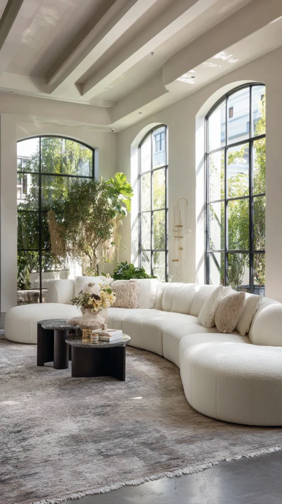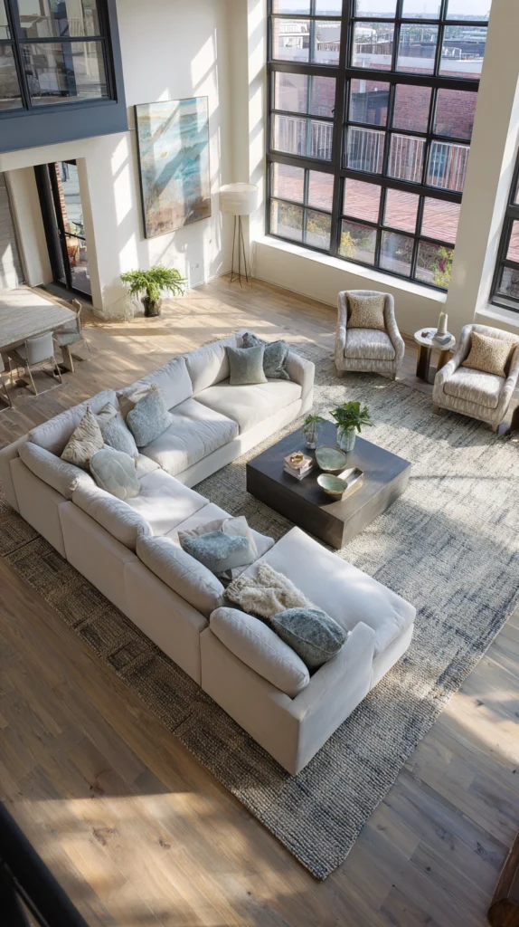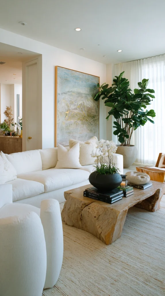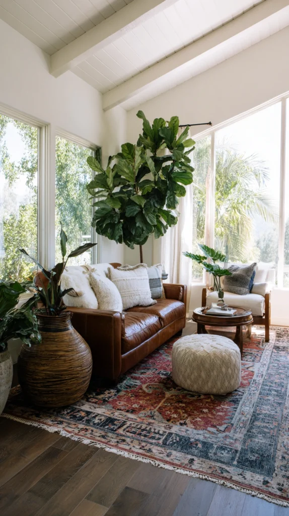 a large fiddle-leaf fig, a dramatic monstera, a substantial bird of paradise, or a cluster of several large potted plants grouped together in a corner or beside a window creates a botanical presence of genuine visual weight and organic warmth that contributes meaningfully to the room’s atmosphere. Large plants also help to humanize a very large room by creating a sense of natural scale that prevents the space from feeling institutional or impersonal.