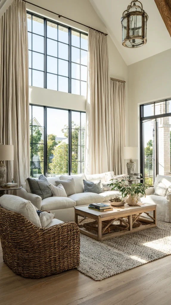 Full-length curtains in a heavyweight fabric. velvet, silk, or a substantial woven linen. hung from ceiling-mounted rods and allowed to pool generously on the floor create the most dramatic and most luxurious window treatment for a large living room. The curtains should be made with enough fabric fullness to hang in generous, deeply folded pleats when closed and to frame the window impressively when open.