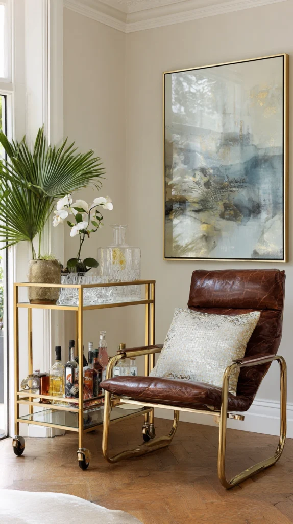A dedicated drinks cabinet, a built-in bar niche, or a beautifully styled bar trolley in a large living room creates a self-contained hospitality zone that serves the room’s entertaining function with a style and efficiency that a drinks tray on a side table cannot match.