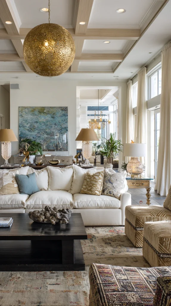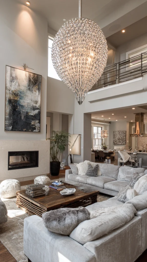 The ceiling of a large living room is a design surface that most people leave entirely unaddressed, and a statement chandelier or pendant light suspended from the ceiling creates an architectural focal point above the room’s primary seating zone that simultaneously resolves the ceiling zone and adds a decorative dimension of genuine ambition.